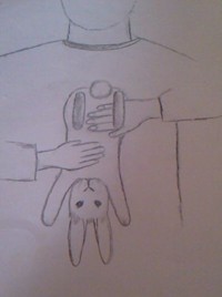 królika głowa do dołu, plecami przywiera do naszego brzucha- jak na rysunku (rys.nr1) Rozciągamy przednie łapy królika- jeśli sam tego nie zrobił, to ważne,